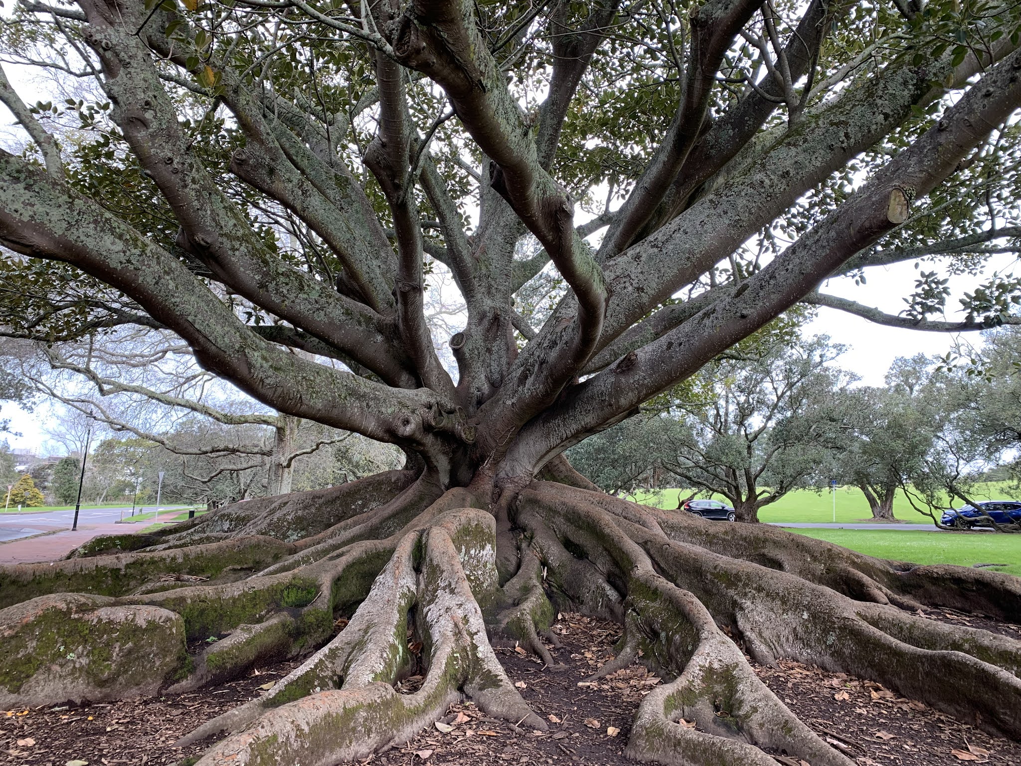 We're obviously not far from water anywhere here but there are also lots of parks and many extinct volcanoes which make for interesting walks. Yesterday we did the "Coast to Coast" walk from Onehunga which took in several high points (literally) including Mount Eden and One Tree hill. It rained the whole time but was still a lovely walk. Our local park, the Domain is the oldest park in Auckland and has the museum at the top. It has some wonderful old trees which I love.